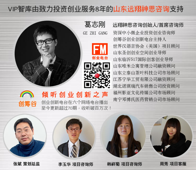 創(chuàng)籌谷智庫VIP卡,是由濟南遠翔神思咨詢推出的VIP服務(wù)卡。濟南遠翔神思咨詢是投融資項目包裝服務(wù)及創(chuàng)業(yè)服務(wù)領(lǐng)域的領(lǐng)先企業(yè),自2008年起,八年內(nèi)先后服務(wù)過近3000家企業(yè),為多家知名大型國企、民營企業(yè)、電信運營商提供過專業(yè)的咨詢與服務(wù)。
