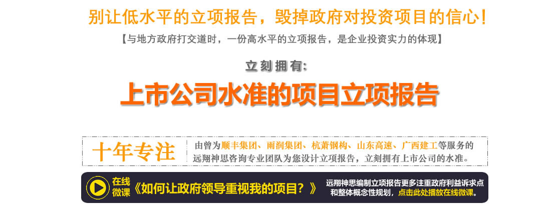 服務(wù)索引:商業(yè)計(jì)劃書(shū) | 可行性研究報(bào)告 | 項(xiàng)目概念性規(guī)劃 | 項(xiàng)目申請(qǐng)報(bào)告 | 項(xiàng)目建議書(shū) | 資金申請(qǐng)報(bào)告 | 項(xiàng)目計(jì)劃書(shū) | 立項(xiàng)報(bào)告| 融資顧問(wèn)